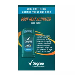 Degree Men Cool Rush antiperspirant deodorant helps keep you fresh and dry, no matter what. A men?s antiperspirant deodorant stick that offers 48 hour original protection with an energizing burst of crisp, green arctic freshness. Whether you?re having a long day in the office, playing sport outdoors or working out in the gym you can be confident you?ll be protected by this deodorant for men from sweat and body odor. Designed by experts to be activated by your body heat, Degree Cool Rush is a men?s antiperspirant deodorant stick that works as hard as you do, keeping you dry when you need it most. As well as being highly effective, Degree Cool Rush has an energizing, crisp scent that will keep you fresh all day. Keep comfortable and confident thanks to Degree Cool Rush?s long-lasting formula that is tough on sweat but not on skin. Stay dry, cool and confident thanks to Degree Men Cool Rush.