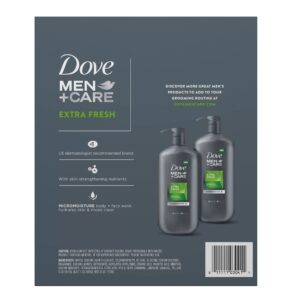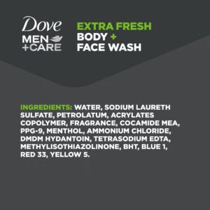 Looking for a body wash for men that leaves skin feeling fresh and hydrated? Add Dove Men+Care Extra Fresh Body and Face Wash to your shower routine! This body wash for men is specifically designed for men?s skin by the #1 dermatologist recommended men?s brand. Dove Men+Care Extra Fresh Body and Face Wash Pump uses its unique MICROMOISTURE technology that activates as you lather the lightweight gel to help hydrate skin and protect it against dryness. Dove Men+Care Body and Face Wash is an easy-to-rinse, hydrating body wash that is clinically proven to fight dry skin better than a regular men?s body soap or shower gel. It is also gentle enough to use as a men?s face wash. Extra Fresh has a clean, crisp scent that will leave you feeling fresh. For best use, pump Dove Men+Care Body and Face Wash on to your palm and rub your hands together to work the shower gel into a light foam to activate the MICROMOISTURE technology. Apply to your body and face. Rinse thoroughly. Dove Men+Care is committed to expanding opportunities for men to experience the transformative effects of care on themselves and others. As part of this, we are championing active fatherhood and paternity leave for dads everywhere, so that more dads can be there from day one. Because when men care, everyone benefits. And as part of our commitment towards sustainability, each Dove Men+Care body and face wash bottle is recyclable and made with 100% recycled plastic, and is PETA certified Cruelty Free.
