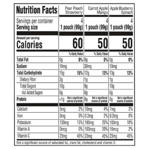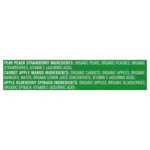 Ingredients: Pear Peach Strawberry Ingredients: Organic Pears, Organic Peaches, Organic Strawberries, Vitamin C (Ascorbic Acid). Carrot Apple Mango Ingredients: Organic Carrots, Organic Apples, Organic Mangoes, Water, Organic Lemon Juice Concentrate, Vitamin C (Ascorbic Acid). Apple Blueberry Spinach Ingredients: Organic Apples, Organic Blueberries, Organic Spinach, Vitamin C (Ascorbic Acid).