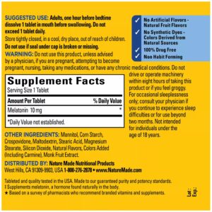 Nature Made Fast Dissolve Melatonin 10 mg Tablets is a maximum strength sleep supplement that naturally** helps you fall asleep faster, and supports restful sleep. Sourced from high-quality ingredients and 100% drug free, these Nature Made Melatonin 10mg quick dissolve tablets contain no artificial flavors, no synthetic dyes, and are non habit forming. These Nature Made 10 mg Melatonin quick dissolve tablets, in mixed berry with other natural flavors, offer a naturally acting sleep aid supplement** that provides short-term sleep support so you can wake up feeling rested. Adults, one hour before bedtime dissolve one quick dissolve Melatonin 10mg tablet in mouth before swallowing. Do not exceed one of these dissolvable Melatonin tablets daily. Nature Made supplements are quality you can trust.** Supplements melatonin, a hormone found naturally in the body.