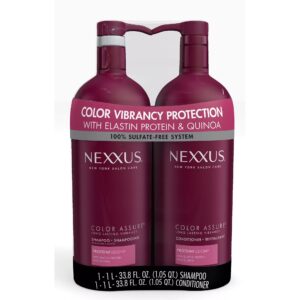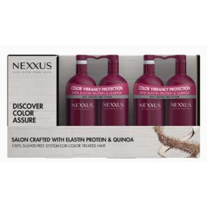 Nexxus Color Assure Shampoo and Conditioner for color-treated hair has been specially formulated to cleanse hair gently while extending color vibrancy. Using our exclusive PROTEINFUSION blend, this sulfate-free shampoo and hydrating conditioner help replenish nutrients, providing long-lasting color vibrancy for up to 8 weeks or 40 washes. Nexxus scientists used Proteomics studies to examine hair damage at the molecular level and found that the main cause of color loss and dullness is hair coloration. With this knowledge in mind, our scientists developed a one-of-a-kind PROTEINFUSION blend with Elastin Protein and Quinoa, along with other ingredients, to create Color Assure formulas that result in long-lasting color vibrancy.