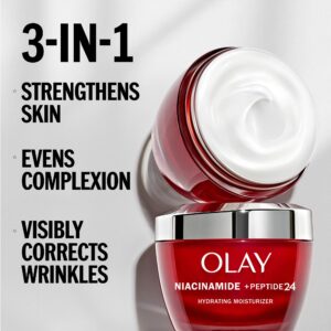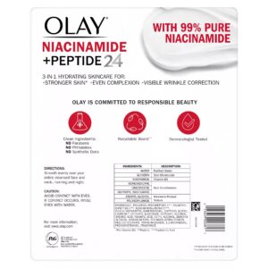 With three benefits in one jar, Olay Regenerist Niacinamide + Peptide 24 Face Moisturizer strengthens skin*, evens complexion, and visibly corrects wrinkles. This hydrating moisturizer, with a delightful, light fragrance, absorbs quickly with no greasy residue, so it can be worn seamlessly under makeup. It?s crafted by Olay’s top scientists with clinically proven technology, containing 99% pure Niacinamide to improve skin?s moisture barrier for 2x stronger skin?. This face cream is also formulated with dermatologist recommended peptides, to support skin?s natural renewal process. They also took care to craft this facial moisturizer with clean ingredients, which means no parabens, phthalates, or synthetic dyes. With Niacinamide + Peptide 24 Face Moisturizer, you?ll experience 24-hours of hydration, and in one week you?ll see improvements in wrinkles and complexion. In one month you?ll see hydrated and visibly improved skin with a 2x stronger skin barrier?. When it comes to skincare, three is always better than one. Olay is serious about their commitments. Their Olay Skin Promise to you is zero skin retouching in all advertising. Olay is the first mass skin care brand in the US to take this stance, because they know real beauty is honestly beautiful. They also guarantee you’ll love your Olay product. If you are not satisfied, they’ll give you your money back via a prepaid card. Must submit within 60 days of purchase. Call toll-free 1-855-845-9797 or visit olay.com/guarantee.